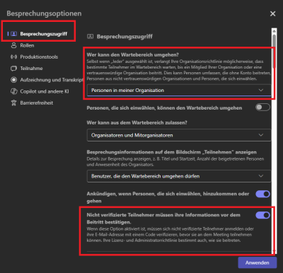• Um Meetings nur für angemeldete Personen zu erlauben müssen in den Besprechungsoptionen folgende Einstellungen getroffen werden: