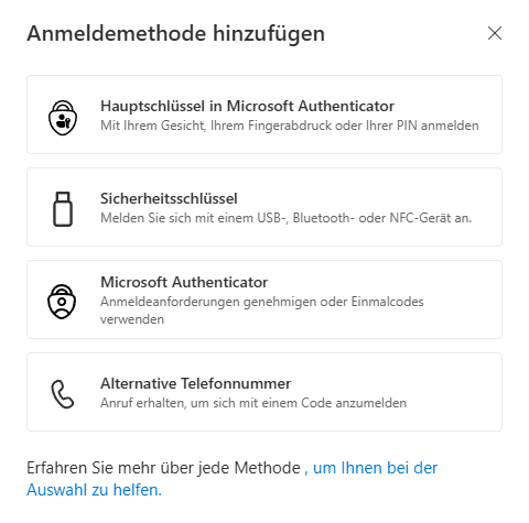 wird einen Passkey in der App erzeugen und als Hauptschlüssel anlegen. Diese Anleitung befasst sich aber damit, eine verbesserte Sicherheit durch das Anlegen eines weiteren Faktors (Microsoft Authenticator) herzustellen. Falls jedoch ein Passkey gewünscht ist, kann auch „Hauptschlüssel in Microsoft Authenticator“ ausgewählt werden