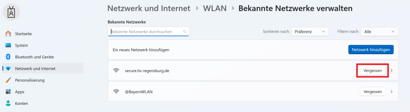 Nach dem Ändern des Passworts des OTH-Nutzeraccounts kann es unter Umständen notwendig sein ein zuvor genutztes WLAN zu entfernen um sich danach mit dem neuen Passwort anmelden zu können. Um ein WLAN zu entfernen können sie unter Windows wie folgt vorgehen: